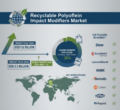 NEWARK, DE, UNITED STATES, January 27, 2026 /EINPresswire.com/ -- The global recyclable polyolefin impact modifiers market is projected to grow from approximately USD 1.6 billion in 2026 to nearly USD 3.1 billion by 2036, expanding at a compound annual growth rate (CAGR) of about 7.1% during the forecast period. This strong growth trajectory reflects rising global demand for high-performance plastic materials that enhance impact resistance while remaining fully compatible with recycling systems, particularly across packaging, automotive, construction, and consumer goods industries.